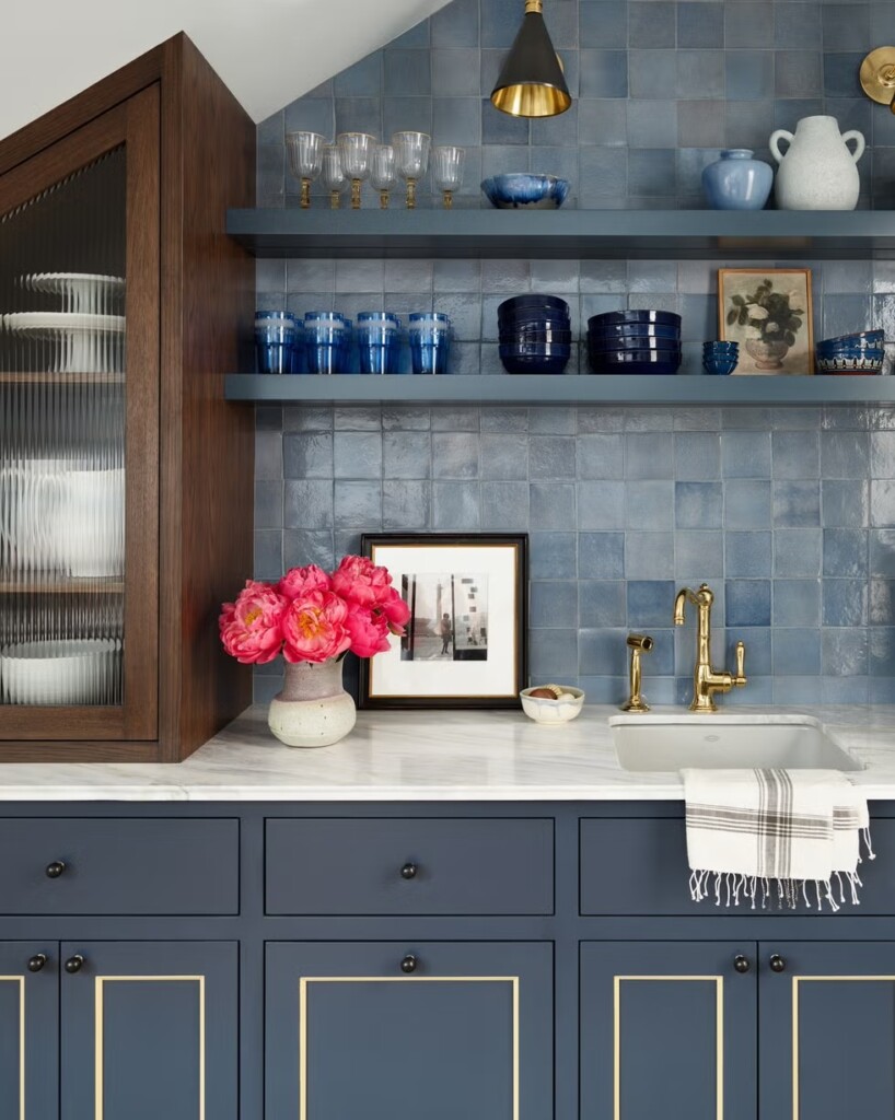 We’re seeing painted cabinetry, mixed finishes, and kitchens that feel more like rooms and not sterile boxes. A soft green island, a deep blue pantry, a warm wood hood, brass hardware that doesn’t match the faucet … and that’s exactly the point.